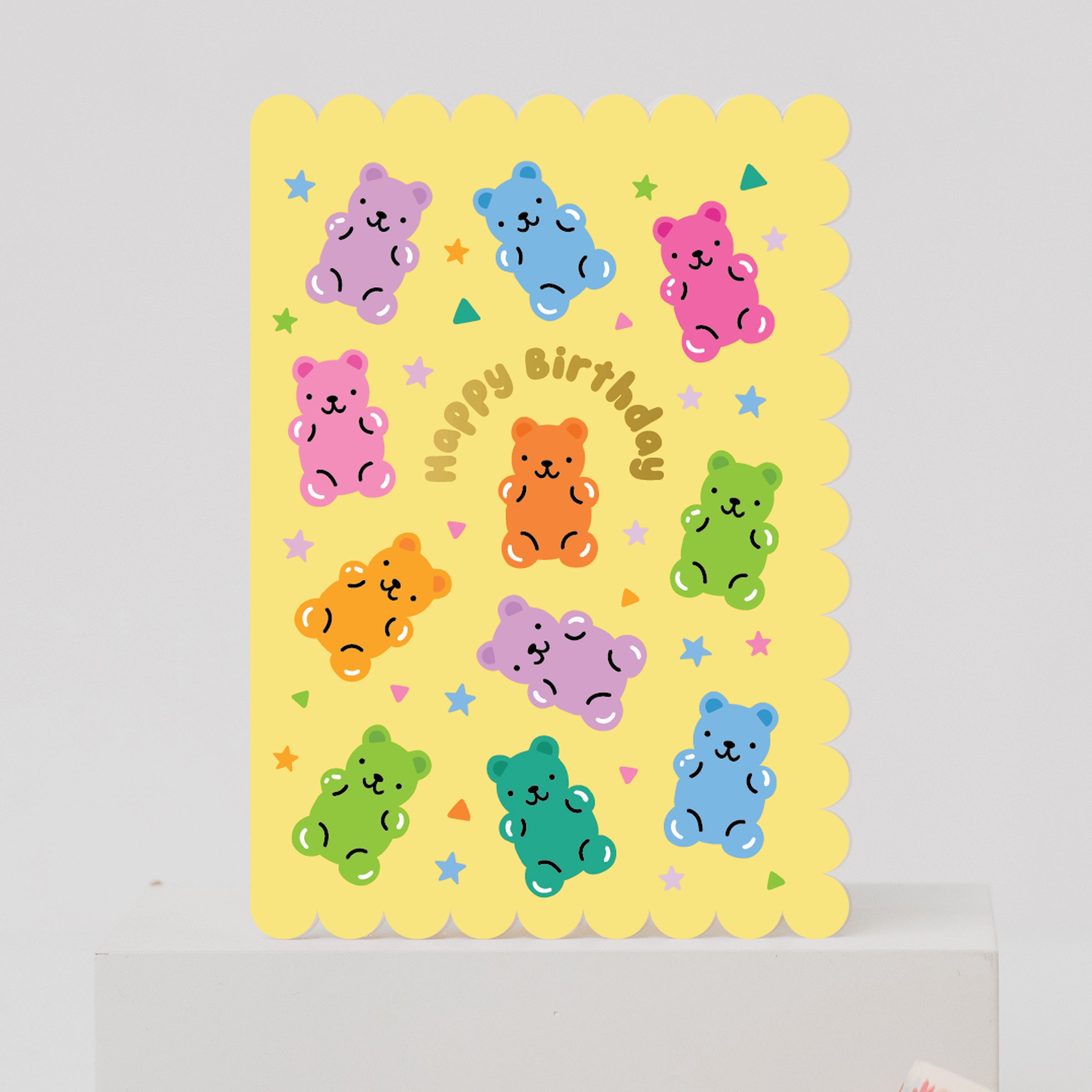 Celebrate birthdays with a burst of colour and sweetness! This Gummy Bear Birthday Card features a cheerful collection of pastel gummy bears, framed by charming yellow scalloped edges. The gold foil ‘Happy Birthday’ lettering adds a touch of sparkle, making it perfect for kids, teens, or anyone young at heart. Printed on high-quality card and paired with a matching envelope, this whimsical card is a fun and memorable way to send birthday wishes.